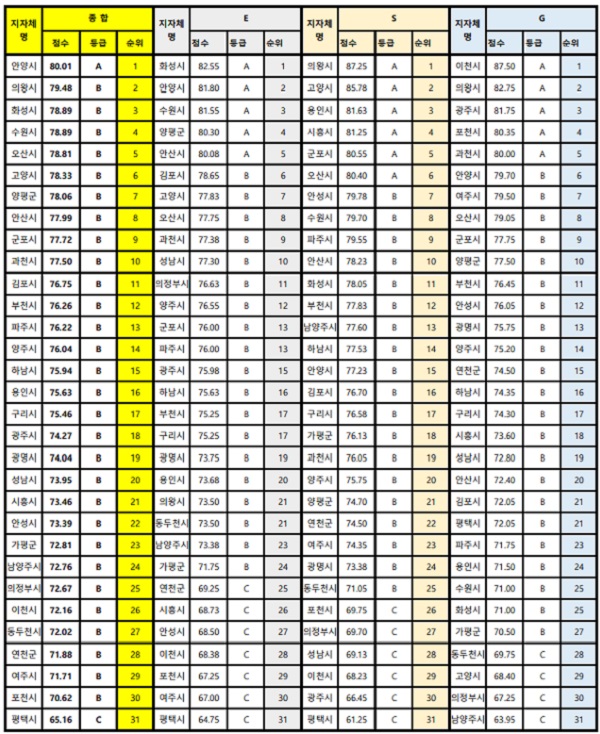 안양시에 이어 의왕시가 경기도 기초자치단체 ESG 평가지수에서 79.84점·B등급으로 2위를 기록했고 ▲화성시(78.89점·B등급) ▲수원시(78.89점·B등급) ▲오산시(78.33점·B등급) 등이 상위 5개 도시에 이름을 올렸다. 성남시는 73.65점·B등급으로 20위에 머물러 '천당 아래 분당'이라는 수식어가 무색해졌다.