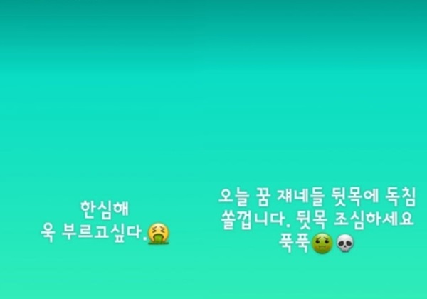 뷔는 15일 팬 커뮤니티 위버스에 "한심하다. '욱' 부르고 싶다"라며 "오늘 꿈 쟤네들 뒷목에 독침 쏠 겁니다. 뒷목 조심하세요 푹푹"이라고 말했다"라고 글을 게재했다.