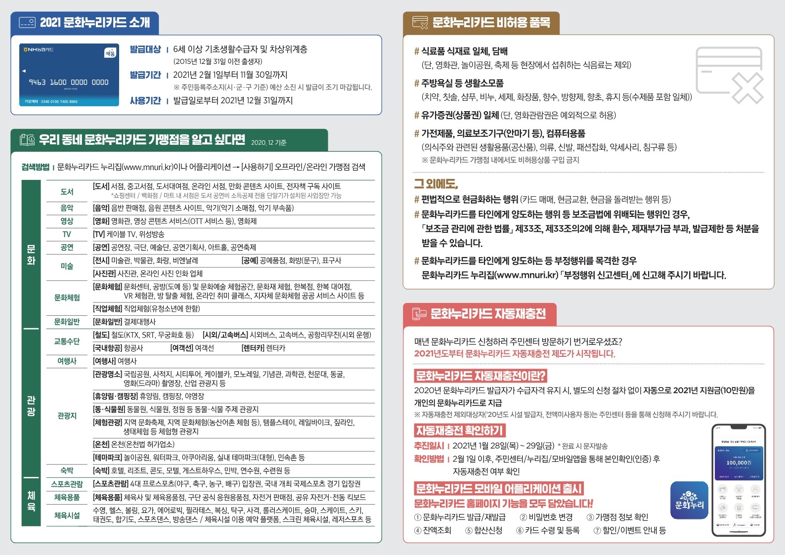'문화누리카드'는 영화·공연·전시·국내 4대 프로 스포츠 관람·수영장·볼링장·탁구장·운동용품·도서·문구 및 음반 구매·음원사이트·OTT 플랫폼·케이블TV·숙박·고속버스·시외버스·철도·사진관 등 문화예술·관광 및 스포츠 활동 분야에서 자유롭게 사용할 수 있다.