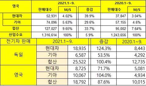 또 다른 전통의 자동차 강국인 영국에서도 현대차·기아의 판매 성장은 올해 두드러졌다. 영국자동차공업협회(SMMT)에 따르면 올해 3분기까지 현대차는 전년 동기 대비 39.9% 증가한 5만2931대를 기아는 같은 기간 29.6% 늘어난 7만4096대를 판매했다. 합산 판매 대수는 12만7027대로 지난해 동기보다 33.7% 증가했다.