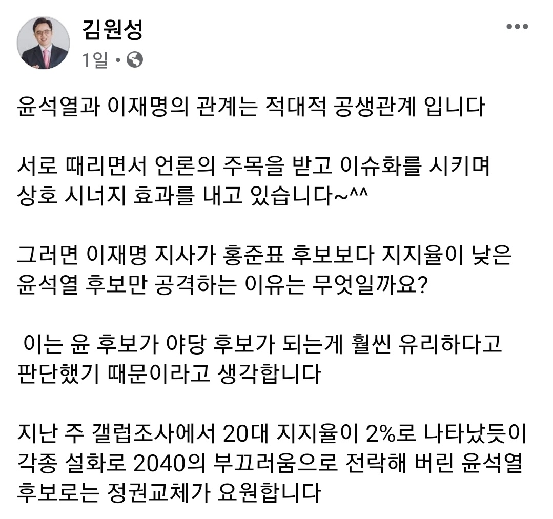 [한스경제=유태경 기자] 홍준표 캠프의 전략분석실장인 김원성 전 최고위원(당시 미래통합당)이 20일 "윤석열과 이재명의 관계는 적대적 공생관계"라고 주장했다.