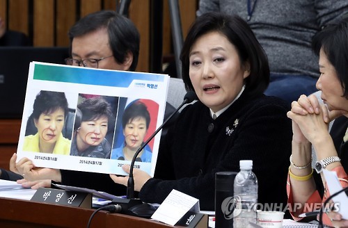 “실 리프팅 시술이 결국 주사바늘을 이용해 피부 속에 실을 심고, 실이 녹으면 탱탱해지는 그런거 아니냐? 자료를 보면 박 대통령 왼쪽, 오른쪽 볼에 주사자국이 뚜렷하게 보인다. 2014년 8월뿐만 아니라 2015년, 2016년에도 (주사자국이) 있다. 주사자국을 보면 실 리프팅을 시술한 것으로 보인다.”