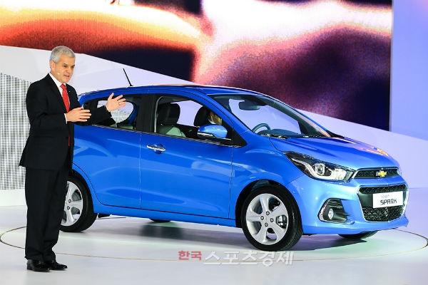 ▲ 동대문 디자인플라자(DDP)에서 1일 열린 쉐보레 '더 넥스트 스파크' 신차발표회에서 세르지오 호샤 한국지엠 사장이 차량을 소개하고 있다. 한국지엠은 이날부터 더 넥스트 스파크의 사전계약에 돌입했다. 본격 판매는 8월부터다. 한국지엠 제공