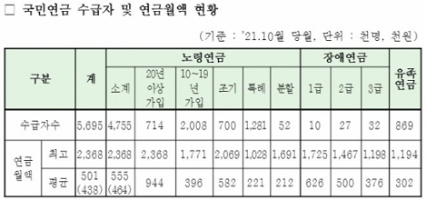 지난해 10월 기준으로 국민연금 수급자는 노령연금 476만명, 장애연금 7만명, 유족연금 87만명이다.