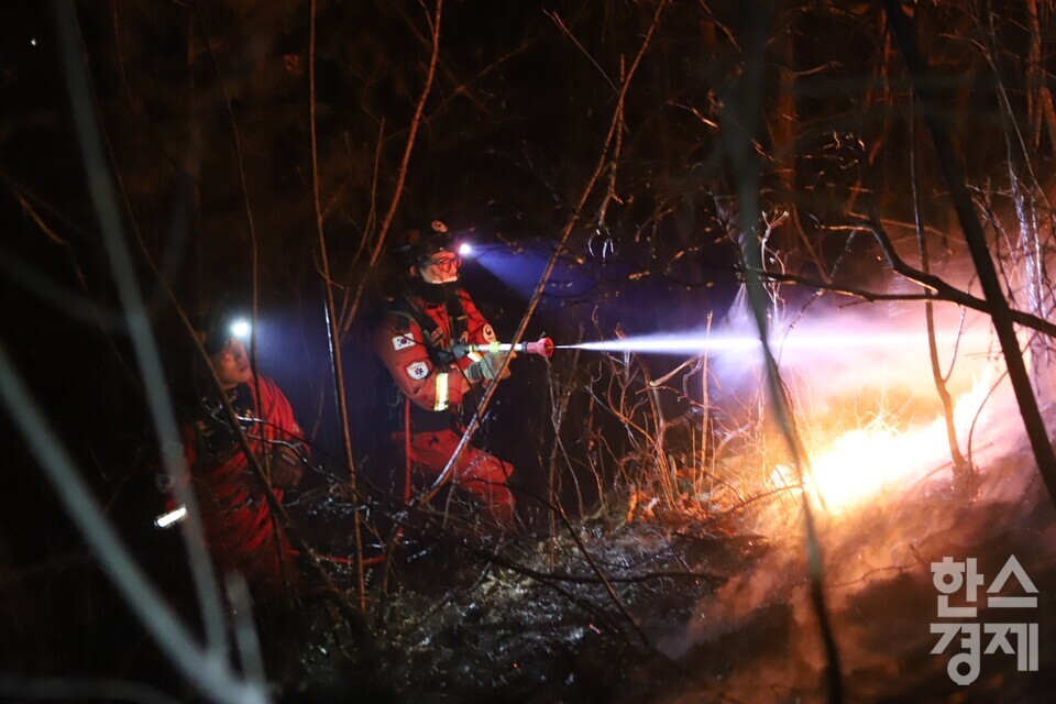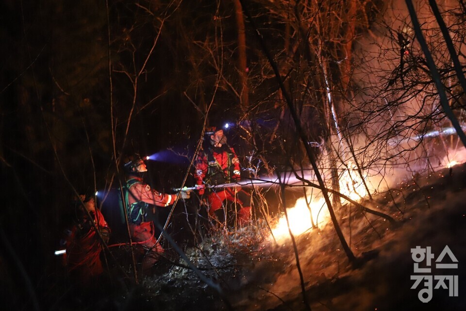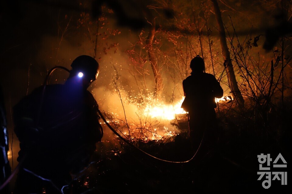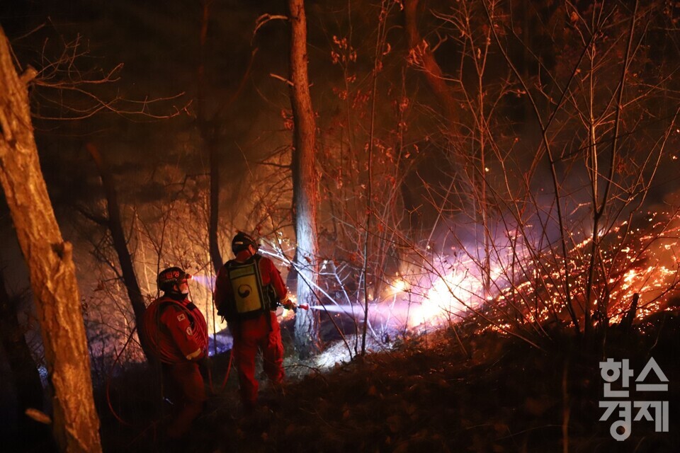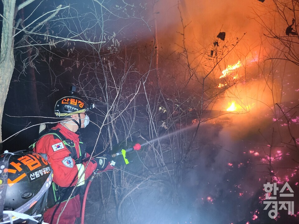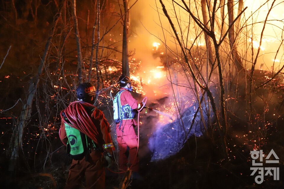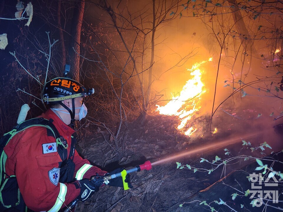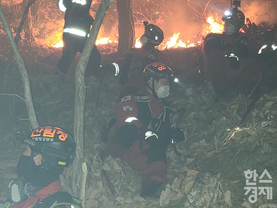 산림 당국은 이날 오전 6시쯤 날이 밝자 헬기 27대를 진화 작업에 투입했다. 지상에서는 산불특수진화대원 등 인력 1300여 명이 투입돼 쉴 새 없이 산불을 끄고 있다.