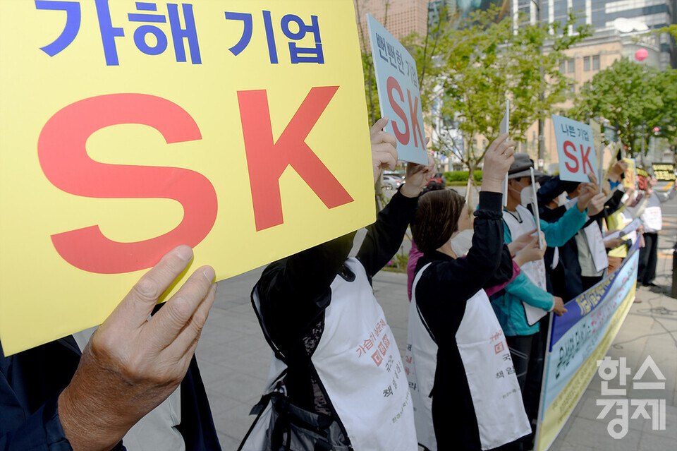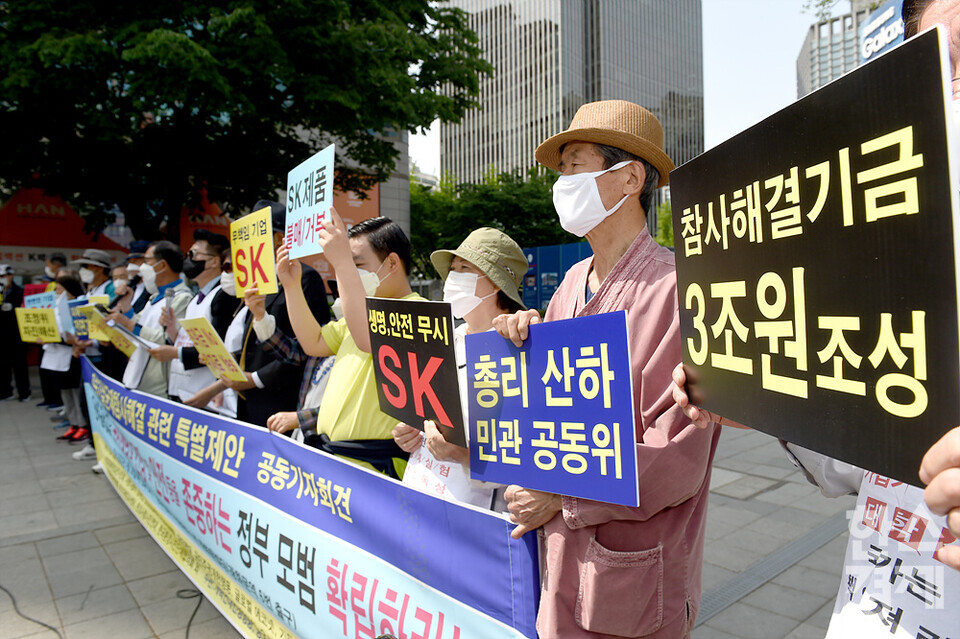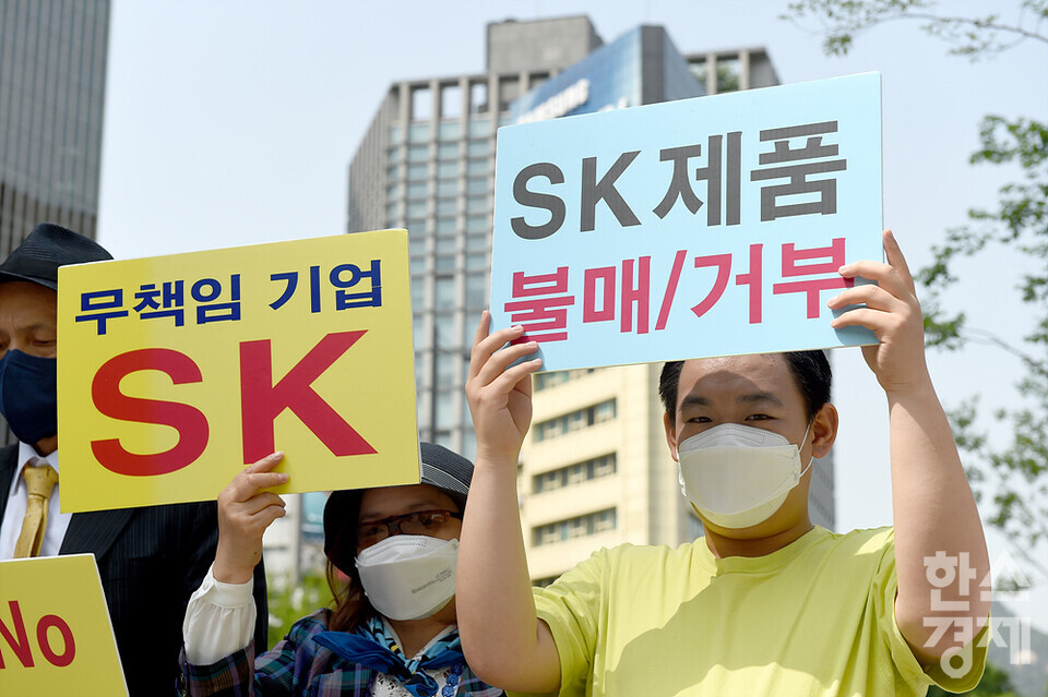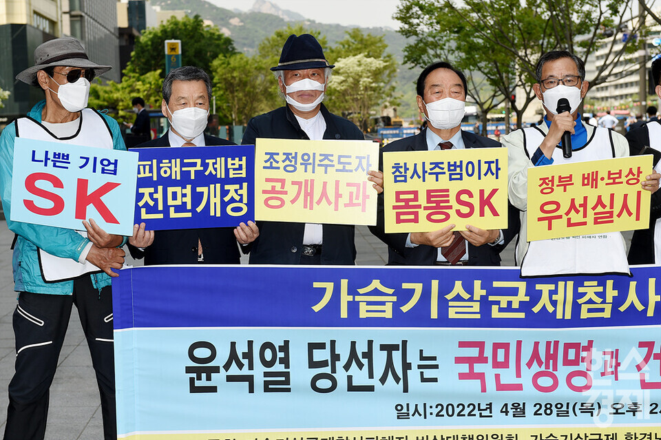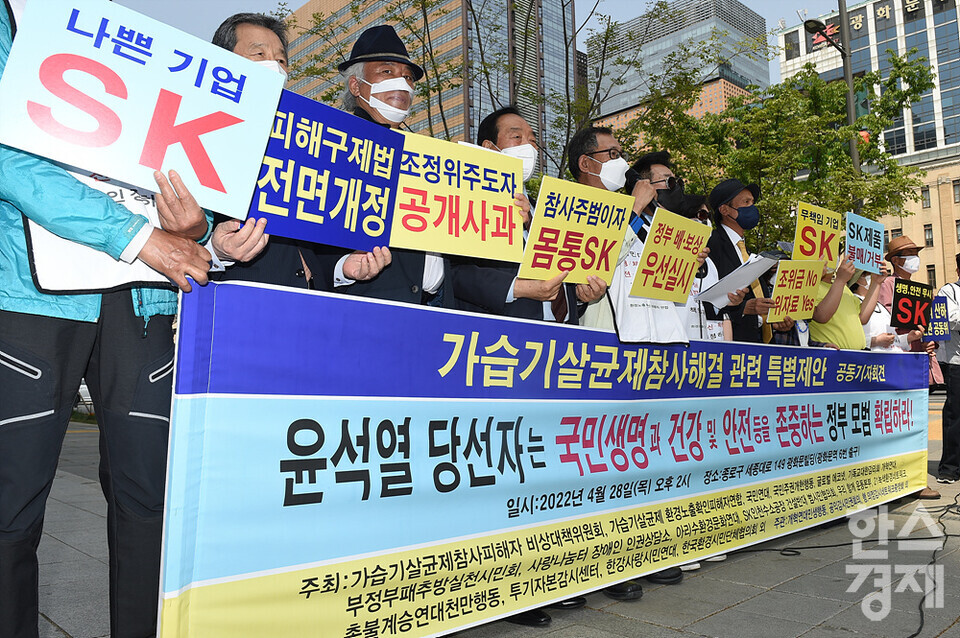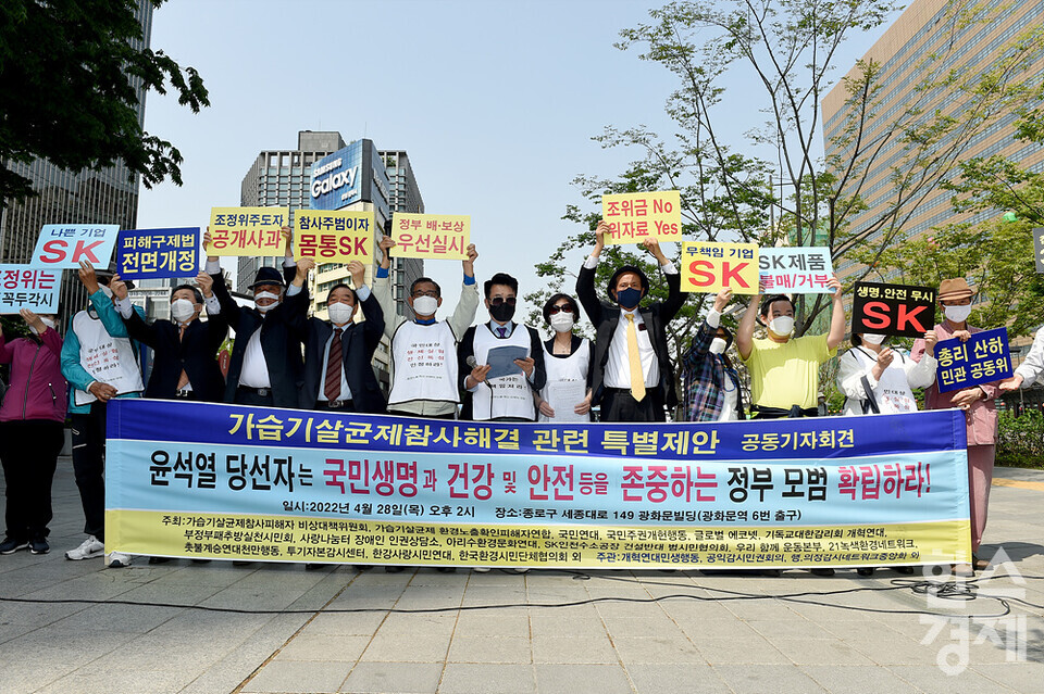 [종로구(서울)=한스경제 김근현 기자] 가습기살균제피해 단체와 시민환경단체 회원들이 28일 오후 서울 종로구 광화문역 6번출구 앞에서 신고자 전원인정과 배상현실화, 3조 원 기금조성으로 정부 배상 우선 실시 등을 주장하는 기자회견을 하고 있다.