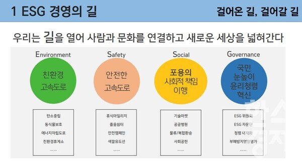 권 팀장은 "우리는 길을 열어 사람과 문화를 연결하고 새로운 세상을 넓혀간다는 문구가 도로공사의 기업 이념"이라며 "도로공사는 ESSG다. 안전이 너무 중요하기 때문에 Safety가 추가된 것"이라고 소개했다.