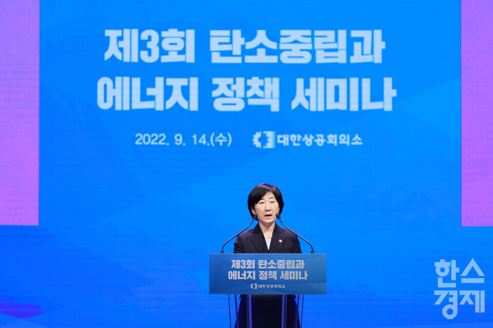 [한스경제=김근현 기자] 최태원(왼쪽 세 번째) 대한상의 회장과 한화진(왼쪽 네 번째) 환경부 장관을 비롯한 주요 참석자들이 14일 오전 서울시 중구 대한상공회의소에서 열린 제3회 탄소중립과 에너지 정책 세미나에서 기념촬영을 하고 있다.