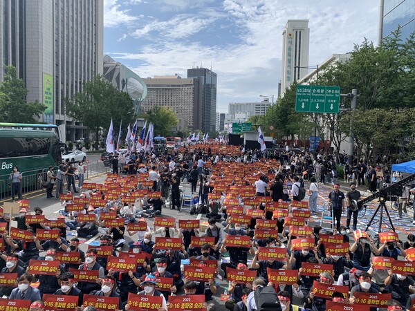 16일 오전, 금융노조 조합원 1만 5000여 명은 세종로사거리에 모여 2022년 전국 금융노동자 총파업 결의대회를 열었다. 본 집회 이후 금융노조 조합원들은 용산 대통령 사무실까지 행진을 이어갔다.
