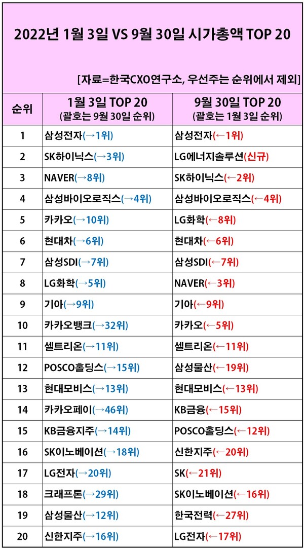 삼성바이오로직스(4위), 현대차(6위), 삼성SDI(7위), 기아(9위), 셀트리온(11위), 현대모비스(13위)는 올해 초와 비교해 순위를 방어했다.