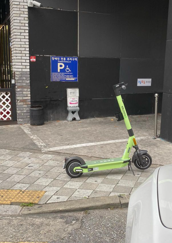 [한스경제=이수현 기자] 한 가수가 장애인 전용 주차구역 앞에 세워진 킥보드에 분노했다.