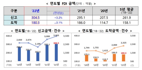 [한스경제=정라진 기자] 2022년 외국인직접투자(FDI)가 2021년에 이어 사상최대 및 최초로 304억5000만달러를 달성했다. 세계 경제의 불확실성 속에서 제조업의 튼튼한 기반과 제도개선·유치노력 등으로 최대실적을 달성, 투자 및 고용 창출에 기여했다고 분석했다.