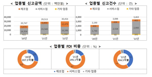 제조업(149.4%)과 기타업종(47.7%)의 신고금액은 증가세가 두드러졌지만, 54.5%로 외국인직접투자에서 절반 이상을 차지한 서비스업(29.6%)의 신고금액은 큰 폭으로 감소했다.