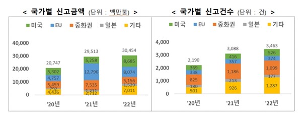 국가별로는 미국(65.2%)과 일본(26.3%), 기타지역(158.5%)은 신고기준으로 전년 대비 증가했지만 영국을 포함한 유럽연합(EU)(36.9%)과 중국, 홍콩 싱가포르, 대만, 말레이시아를 포함한 중화권(31.6%)은 감소했다.