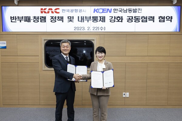 한국남동발전은 22일 진주 본사에서 한국공항공사와 반부패·청렴 정책 및 내부통제 역량 강화를 위한 업무협약을 체결했다.
