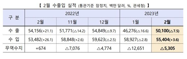 수출은 글로벌 경기둔화가 지속되고 반도체 업황이 악화된 탓에 지난해에 비해 7.5% 감소한 501억달러를 기록했다. 수입은 지난해 2월에 비교해 3.6%가 증가한 554억달러를 기록했다. 이는 에너지 수입 증가가 같은 기간 19.7% 늘어난 영향이 크다.
