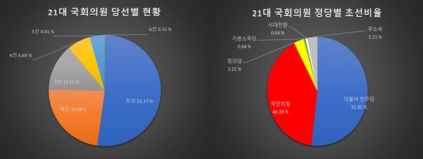 국회에 따르면 21대 총 299명 의원 중 156명이 초선의원이다. 전체 중 과반이 넘는 52.17%가 21대에서 국회 첫발을 내디뎠다. 정당별로 비율을 따져보면 △더불어민주당 81명(51.92%) △국민의힘 63명(40.38%) △정의당 5명(3.21%) △기본소득당 1명(0.64%) △시대전환 1명(0.64%) △무소속 5명(3.21%) 등이다.