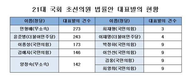 초선의원 중 대표발의를 가장 많이 한 의원은 무소속 민형배 의원이었다. 민 의원이 대표발의한 법안은 총 273건으로 나머지 초선의원들을 가볍게 따돌렸다. 다음으로 더불어민주당 윤준병 의원이 243건으로 뒤를 쫓았다. 이밖에 △국민의힘 이종성 의원(173건) △국민의힘 김예지 의원(146건) △무소속 양정숙 의원(142건)이 뒤를 이었다. 아울러 더불어민주당 최혜영 의원 등 17명이 100건 이상의 법안을 대표발의한 것으로 나타났다.