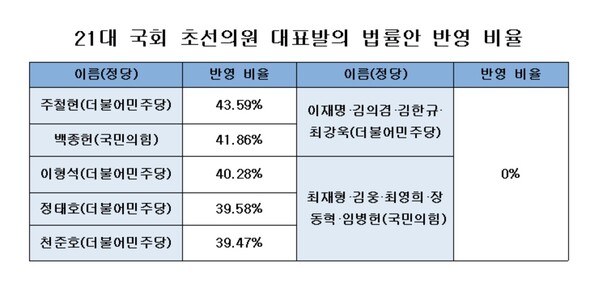 21대 초선의원들이 대표발의한 법률안 중 법안에 반영된 비율(대안반영폐기 포함)을 살펴보면 40%대를 넘는 의원이 총 3명이었다. 더불어민주당 주철현 의원이 43.59%로 가장 많았으며 국민의힘 백종헌 의원(41.86%), 더불어민주당 이형석 의원(40.28%)이 뒤를 이었다. 이밖에 더불어민주당 정태호 의원(39.58%)과 천준호 의원(39.47%)이 다섯 손가락 안에 들었다.