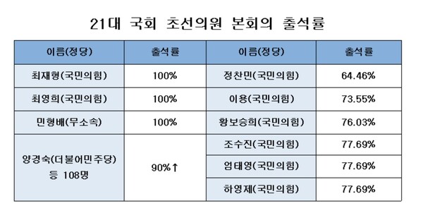 구체적으로 국민의힘 최재형·최영희 의원과 무소속 민형배 의원이 100% 출석률을 기록했다. 이 밖에 초선의원 69.23%에 해당하는 108명이 출석률 90%대를 보이며 준수한 성적표를 받았다. 초선 10명 중 7명 이상이 90% 이상의 출석률을 보인 셈이다.