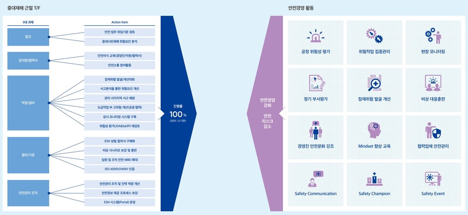 또, 자율 안전관리 문화 정착을 위해 안전문화 수준을 진단하고, 문화 향상을 위한 다양한 이벤트와 캠페인을 실행하고 있다. 경영진의 안전 리더십을 바탕으로 전 계층의 임직원이 안전활동에 참여·협의·소통함으로써 선진 안전문화 구축을 위해 노력하고 있다.