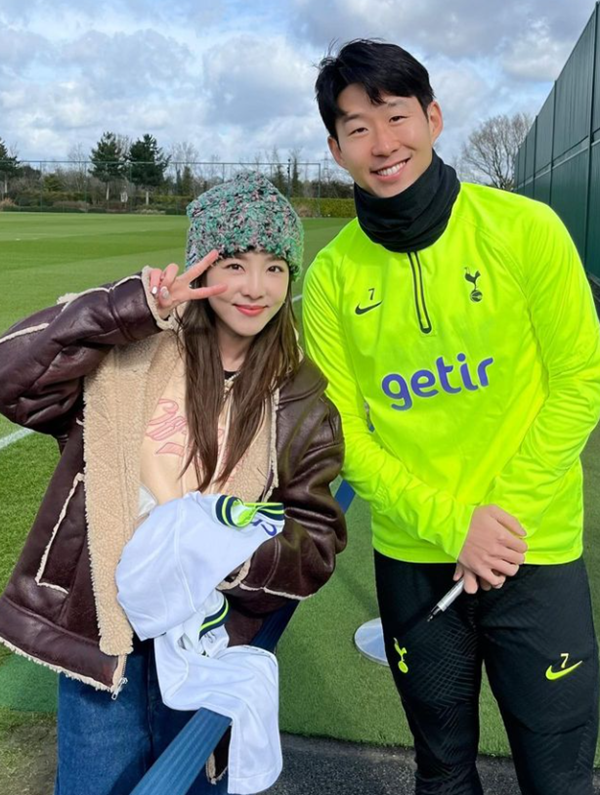 축구선수 손흥민과 만난 산다라박은 손가락으로 브이(V)를 그리며 밝은 미소를 짓고 있다. 축구팬으로 유명한 산다라박은 이어 히샬리송, 해리 케인 등 여러 선수들을 만나 기념 사진을 촬영했다.
