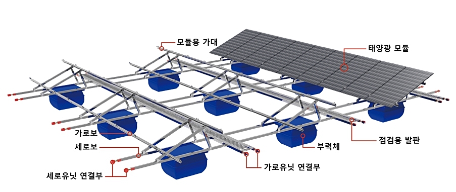 3통(通)은 이 회사 수상태양광 시스템의 가장 큰 장점이다. 햇빛·바람·물이 잘 통하는 구조로 설계돼 친환경적이며, 강한 비바람과 같은 외력에 유연하게 대응이 가능한 설계구조가 특징이다.