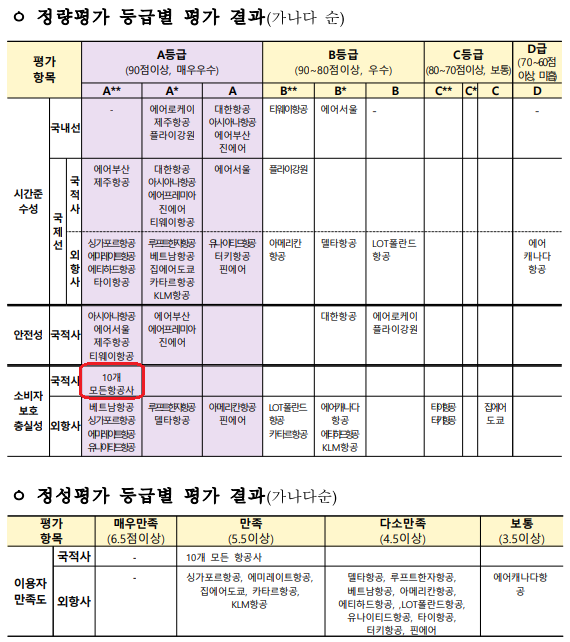 [한스경제=성은숙 기자] 국토교통부가 지난해 항공교통서비스를 평가한 결과 국적항공사 10개 모두 소비자 보호를 위한 사전·사후 조치 수준이 매우 우수한 것으로 평가됐다.