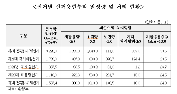 실제로 지난 5년간(2018년~2022년)동안 실시한 다선 번의 선거에서 발생한 폐현수막은 1만3985톤에 달한다. 선거철 마다 막대한 폐현수막이 쏟아지지만 재활용률은 약 25%로 저조한 실정이다.