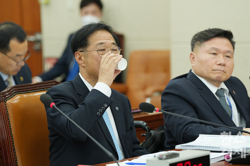 23일 오후 서울 여의도 국회에서 환경노동위원회 국정감사가 열리고 있다. 임춘건 한국폴리텍 기획훈련이사가 물을 마시고 있다. /최대성 기자 dpdaesung@sporbiz.co.kr 2023.10.23.