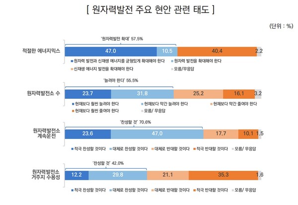 국내 원전 계속운전에 대해서는 응답자 10명 중 7명이 찬성하는 것으로 나타났고, 절반 이상이 '국내 원자력 발전량을 늘려야 한다'고 답했다.