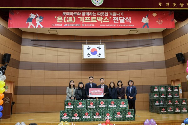 매년 폭설과 한파 피해를 겪고 있는 강원도 원주시에 위치한 호저초등학교는 전교생 수 45명 이하의 소규모 초등학교로, 해당 지역의 초등학교 중 가장 작은 학급 규모를 가지고 있다. 올해도 기상이변 등으로 한파가 예상되는 만큼 롯데마트는 농어촌 지역 소규모 학교 학생들의 따뜻한 겨울 나기를 위해 패딩과 보습 크림, 간식 등 한파에 실질적 도움이 될 수 있는 물품들이 담긴 ‘온(溫)기프트박스’를 전달하게 되었다.