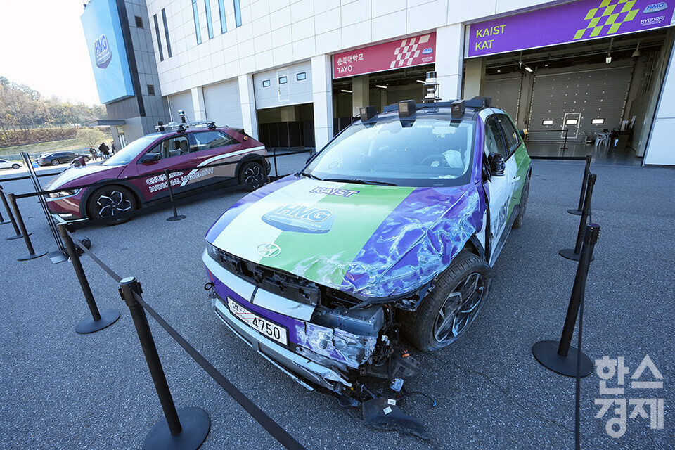 10일 오후 경기도 용인시 에버랜드 스피드웨이에서 '2023 자율주행 챌린지'가 열리고 있다. 전날 주행중 사고로 파손된 충북대학교 TAYO팀의 차량이 전시돼 있다. /최대성 기자 dpdaesung@sporbiz.co.kr 2023.11.10.