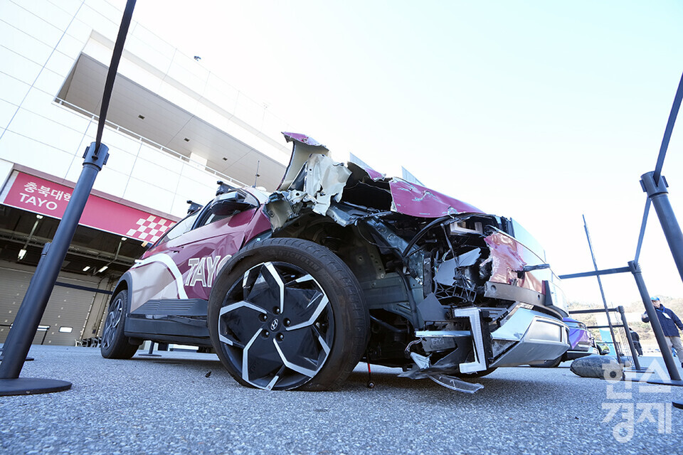 10일 오후 경기도 용인시 에버랜드 스피드웨이에서 '2023 자율주행 챌린지'가 열리고 있다. 전날 주행중 사고로 파손된 차량들이 전시돼 있다. /최대성 기자 dpdaesung@sporbiz.co.kr 2023.11.10.