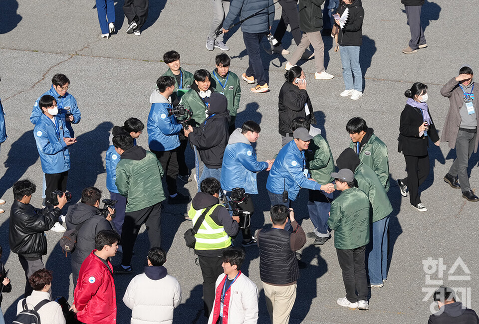 10일 오후 경기도 용인시 에버랜드 스피드웨이에서 '2023 자율주행 챌린지'가 열리고 있다. 카이스트 EureCar-R팀과 건국대 AutoKU-R팀이 대회를 마친 후 악수를 나누고 있다. /최대성 기자 dpdaesung@sporbiz.co.kr 2023.11.10.