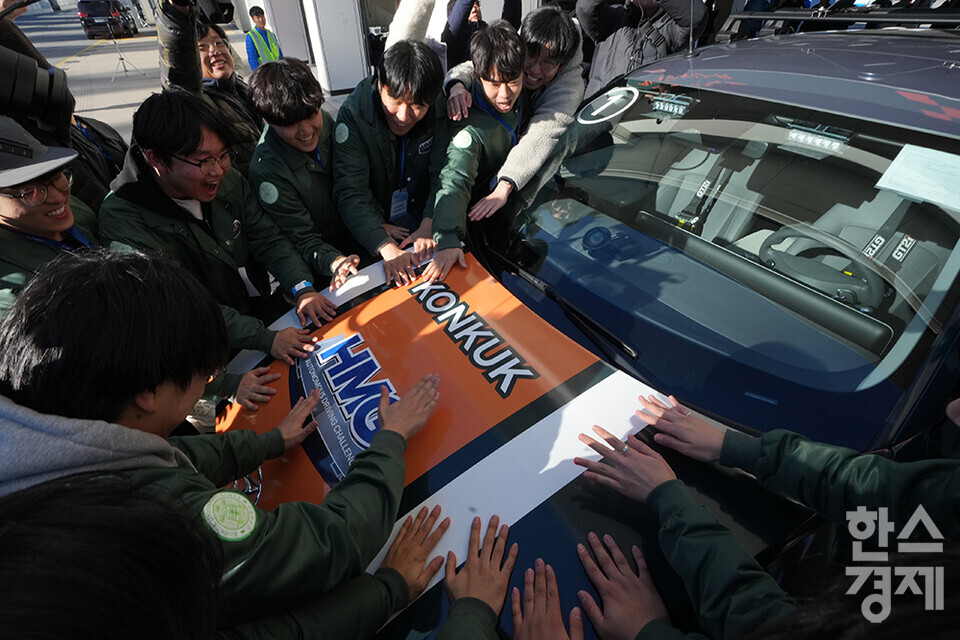10일 오후 경기도 용인시 에버랜드 스피드웨이에서 '2023 자율주행 챌린지'가 열리고 있다. 건국대 AutoKU-R팀이 우승한 직후 차량 앞에서 기념촬영을 하고 있다. /최대성 기자 dpdaesung@sporbiz.co.kr 2023.11.10.