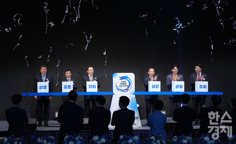 3일 오후 서울 소공동 롯데호텔에서 2024 범금융 신년인사회가 열리고 있다. (왼쪽부터) 정완규 여신금융협회장, 김철주 생명보헙협회장, 조용병 은행연합회장, 서유석 금융투자협회장, 이병래 손해보험협회장, 오화경 상호저축은행중앙회장이 비전 세리머니를 하고 있다. /최대성 기자 dpdaesung@sporbiz.co.kr 2024.01.03.