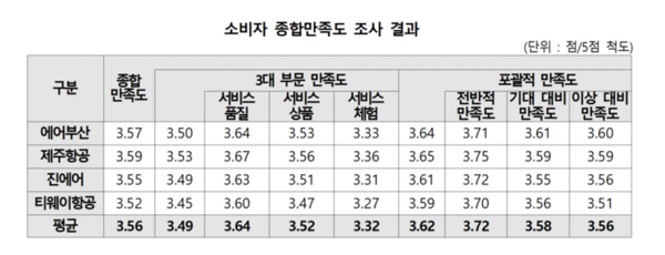 한국소비자원은 4일 최근 2년동안 국내 저가 항공사를 이용한 경험이 있는 소비자 1600명을 대상으로 설문조사를 진행한 결과, 국내 저가 항공 4개 사의 종합만족도는 평균 3.56점(5점 만점)으로 나타났다고 밝혔다. 업체별로는 제주항공(3.59점)이 상대적으로 가장 높았으나 업체 간 점수 차이는 오차범위 내였다.