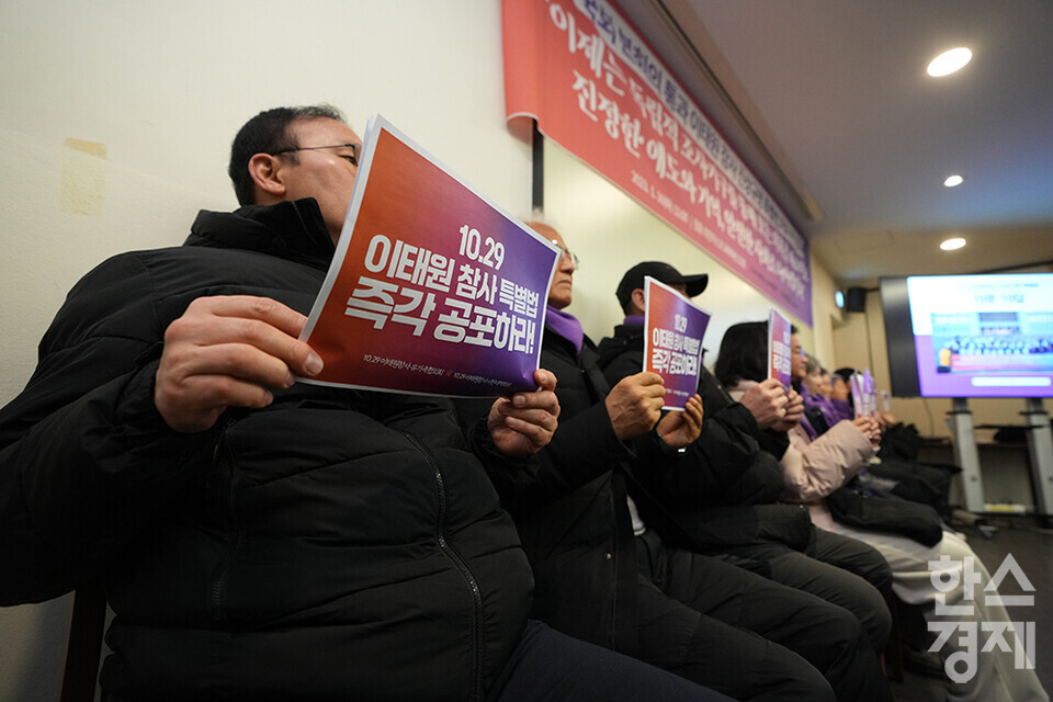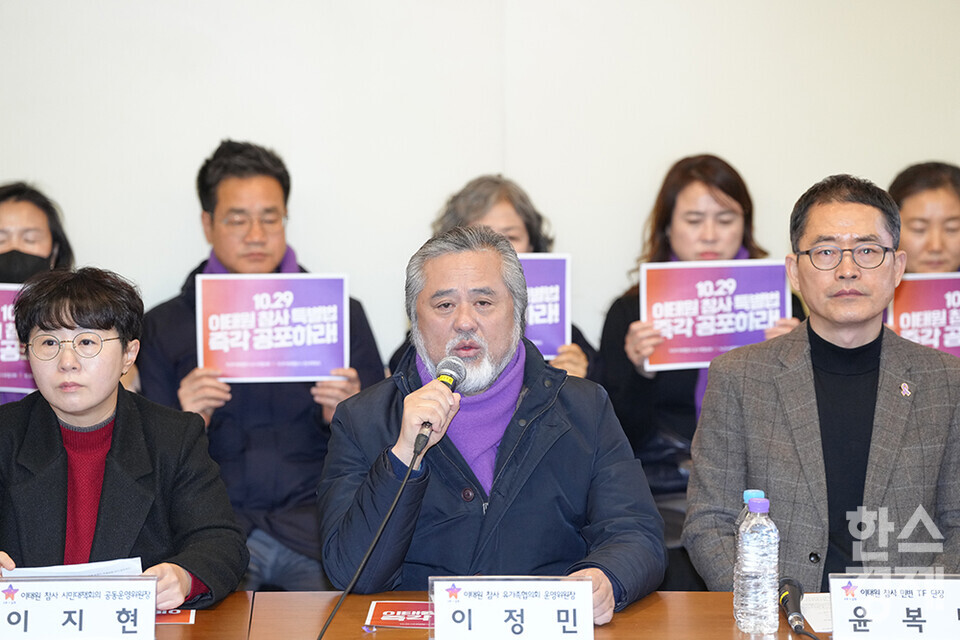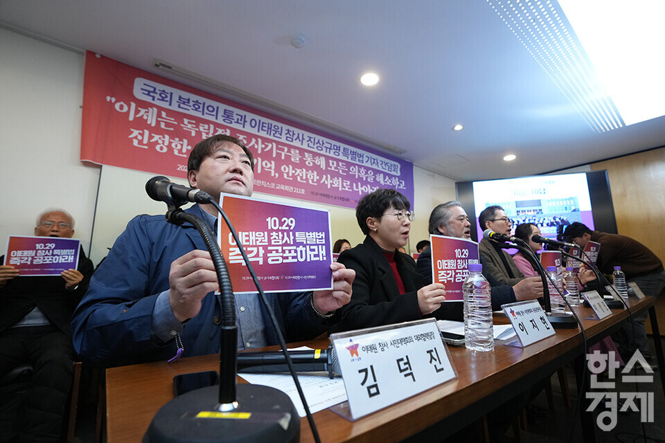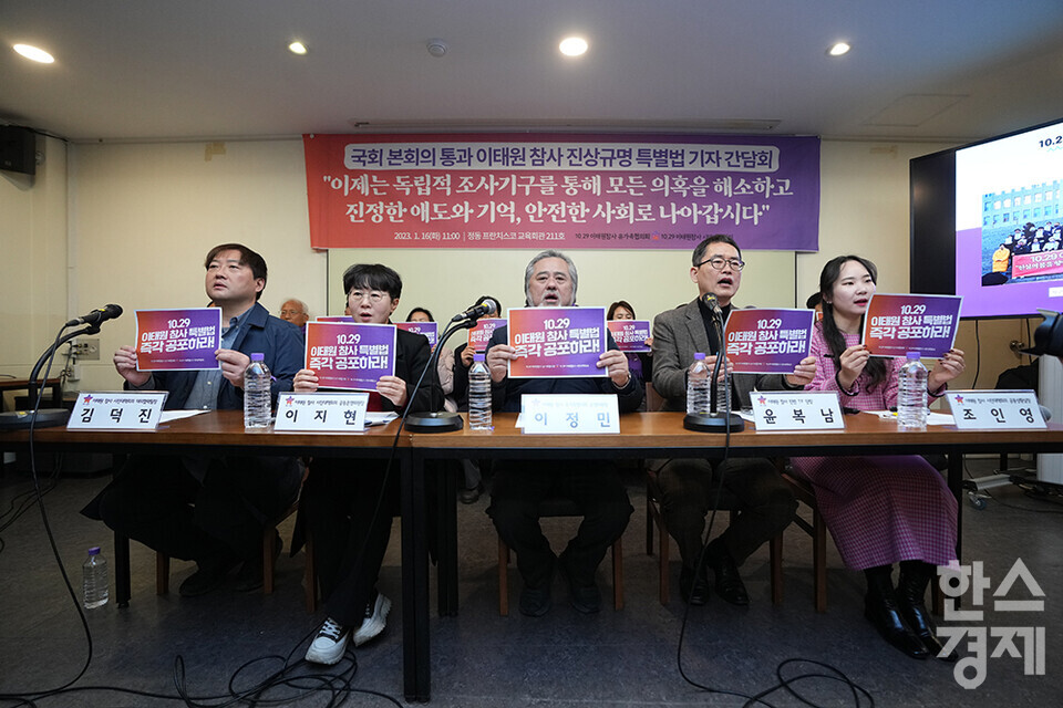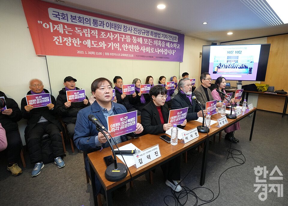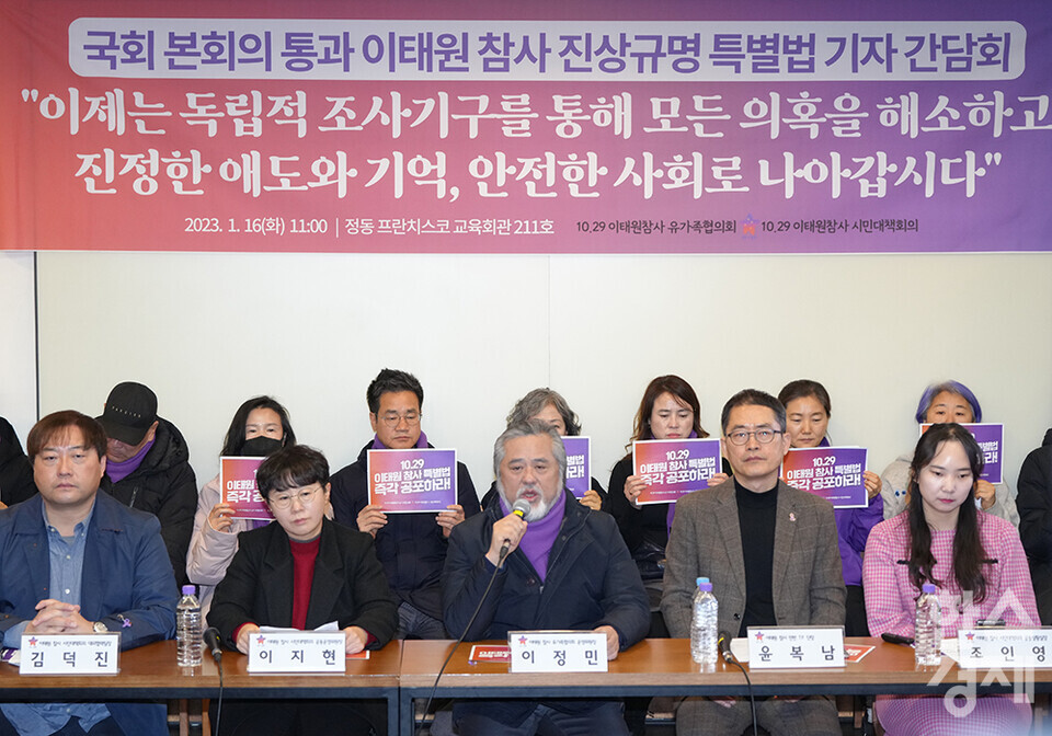 [한스경제=최대성 기자] 16일 오전 서울 정동 프란치스코 교육회관에서 국회 본회의 통과 이태원 참사 진상규명 특별법 기자간담회가 열리고 있다.