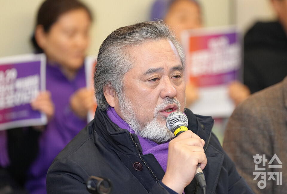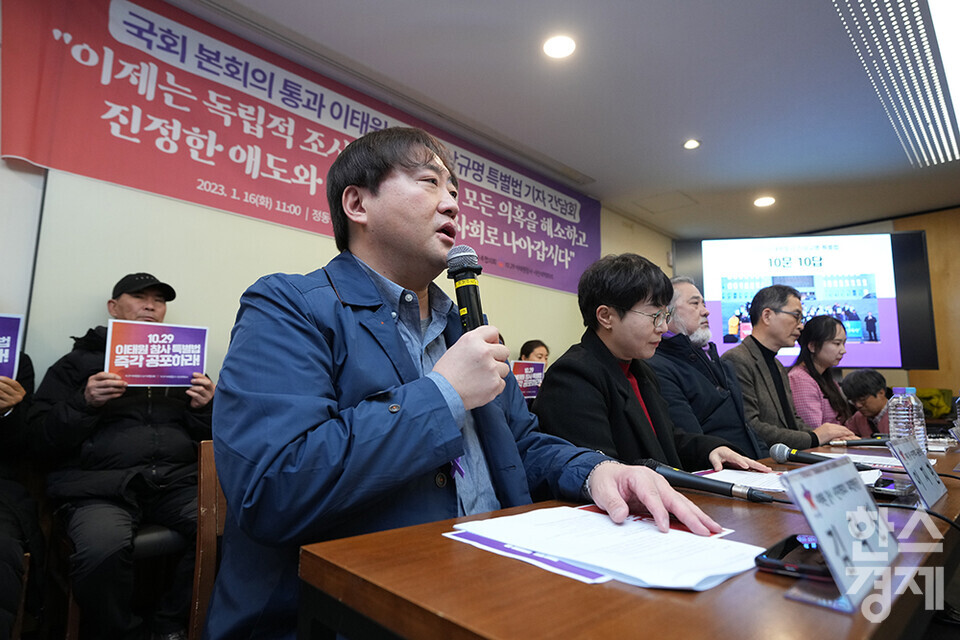 김덕진 이태원 참사 시민대책회의 대외협력팀장이 16일 오전 서울 정동 프란치스코 교육회관에서 열린 국회 본회의 통과 이태원 참사 진상규명 특별법 기자간담회에서 발언하고 있다. /최대성 기자 dpdaesung@sporbiz.co.kr 2024.01.16.