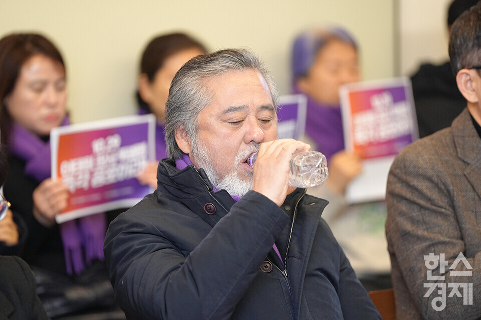 이정민 이태원 참사 유가족협의회 운영위원장이 16일 오전 서울 정동 프란치스코 교육회관에서 열린 국회 본회의 통과 이태원 참사 진상규명 특별법 기자간담회에서 물을 마시고 있다. /최대성 기자 dpdaesung@sporbiz.co.kr 2024.01.16.