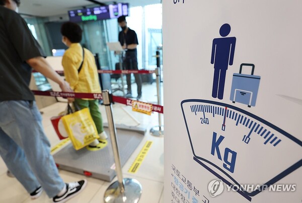 김포국제공항에서 아시아나항공 국제선을 이용하는 승객들은 출발 게이트에서 측정대에 올라 몸무게를 재면 된다. 측정은 착용한 의류와 기내에 들고 타는 수하물의 무게를 모두 함께 재는 방식으로 이뤄진다.
