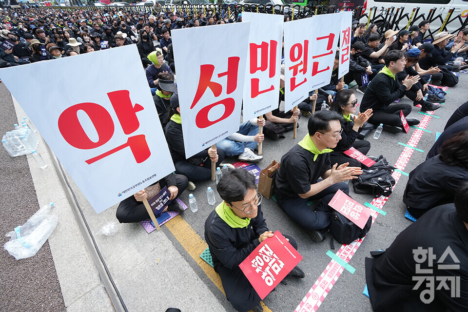[한스경제=최대성 기자] 29일 오후 서울 시청역 앞에서 전국공무원노동조합과 대한민국공무원노동조합총연맹 주최로 공노총(대한민국공무원노동조합총연맹, 악성 민원 희생자 추모 공무원노동자대회가 열리고 있다. 참석자들이 손 피켓을 들고 구호를 외치고 있다.