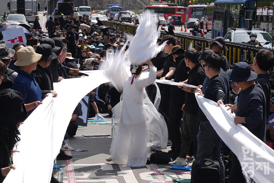29일 오후 서울 시청역 앞에서 전국공무원노동조합과 대한민국공무원노동조합총연맹 주최로 공노총, 악성 민원 희생자 추모 공무원노동자대회가 열리고 있다. 본격적인 행사에 앞서 희생자들을 추모하는 진혼무가 선보이고 있다. /최대성 기자 dpdaesung@sporbiz.co.kr 2024.04.29.