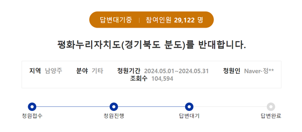 청원인 A씨는 “이 분도가 주민들 의견을 반영한 것이 맞는가”라며 “저를 비롯해 이웃 주민 대다수가 경기북도 분리 정책에 대해 반대하는 입장이다. ‘평화누리특별자치도’ 이름부터 코미디 프로그램에서나 풍자 당할 우스꽝스러운 이름”이라며 불쾌해했다.