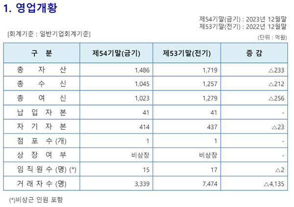 SNT저축은행을 찾는 거래자 발길도 끊기고 있다. 2023년 말 기준으로 SNT저축은행을 찾은 거래자 수는 3339명으로 2022년 말(7474명) 대비 4135명이 줄어든 것으로 나타났다. 이에 1년 새 수신과 여신 규모 모두 줄고 총자산 덩치도 쪼그라들었다. SNT저축은행의 지난해 말 기준 총자산은 1486억원(직전 년 1719억원 대비 233억원↓), 총수신 1045억원(직전 년 1257억원 대비 212억원↓), 총여신 1023억원(직전 년 1279억원 대비 256억원↓) 등이다.