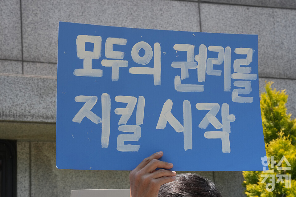 21일 오후 서울 종로구 헌법재판소 정문 앞에서 ‘희망'의 메리골드가 피어난 기후소송 2차 공개변론 기자회견이 열리고 있다. 참석자들이 손 피켓을 들고 있다. /최대성 기자 dpdaesung@sporbiz.co.kr 2024.05.21