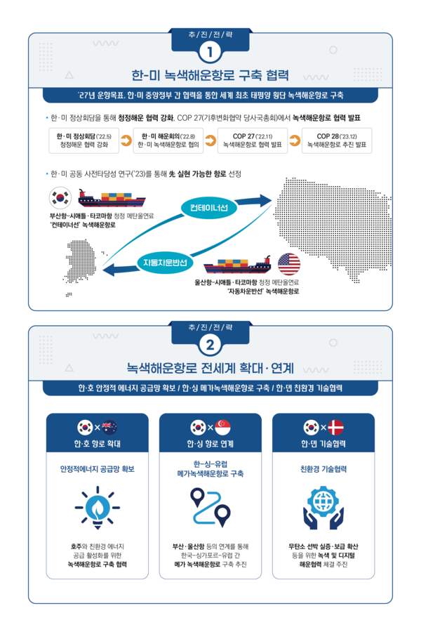 우선 한·미 중앙정부 간 협력을 통해 세계 최초로 태평양 횡단 ‘녹색해운항로’를 구축한다. 한국은 지난 2022년 ‘제27차 유엔기후변화협약 당사국 총회’에서 한-미 녹색해운항로 구축 협력을 발표한 후, 사전 타당성 조사를 통해 부산·울산항과 미국 시애틀·타코마 항 간 컨테이너선 항로와 자동차운반선 항로를 예비 녹색해운항로로 선정했다.