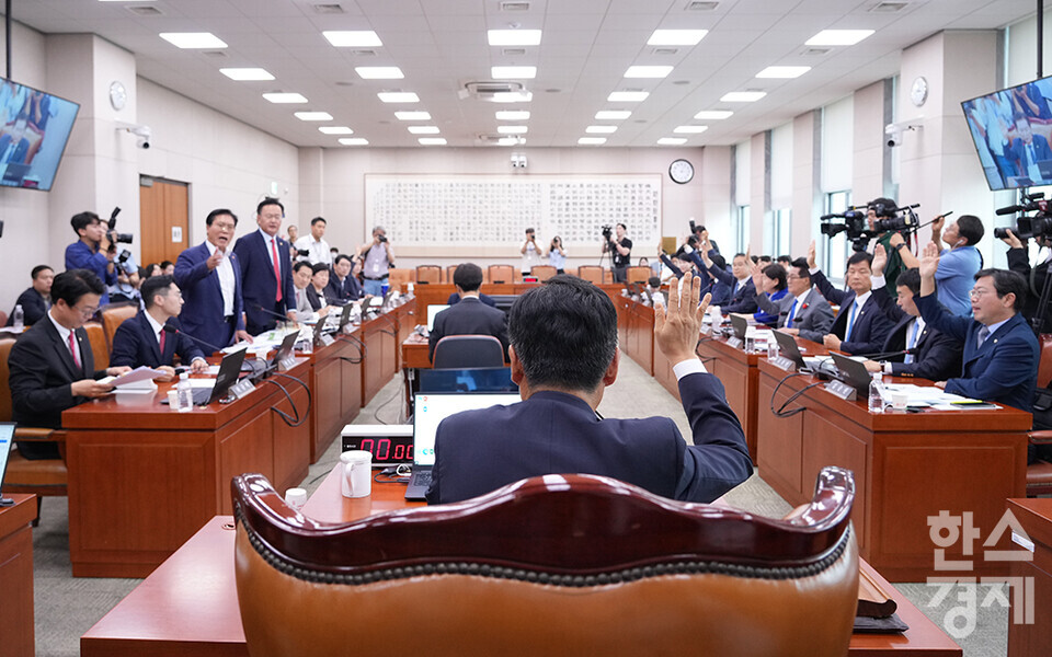 [한스경제=최대성 기자] 9일 서울 여의도 국회에서 법제사법위원회 전체회의가 열리고 있다. 이날 국민의힘 의원들이 정청래 법사위원장의 회의진행방식에 항의하며 퇴장한 가운데, 윤석열 대통령 탄핵소추안 즉각 발의 요청에 관한 청원 관련 청문회 실시계획서 채택의 건 관련 안건 등이 처리됐다.
