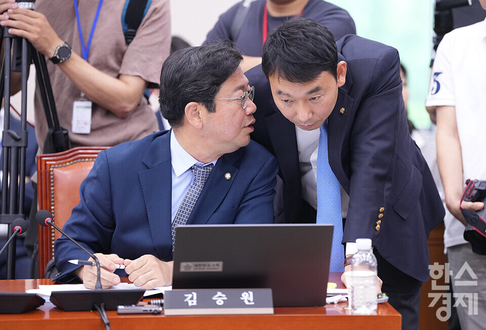 9일 서울 여의도 국회에서 법제사법위원회 전체회의가 열리고 있다. 김승원 더불어민주당 간사가 김용민 의원과 이야기를 하고 있다. /최대성 기자 dpdaesung@sporbiz.co.kr 2024.07.09.